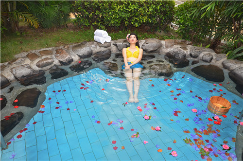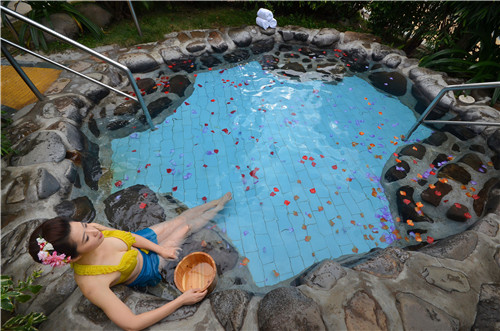 在露天溫泉區(qū),設(shè)有添加各種中菜肴的特色溫泉池。如芬芳一人、安神醒腦的香薰池;潤滑凝脂、內(nèi)白肌膚的牛奶池;大補元氣,生津安神的人參池以及米酒池、當歸池、金銀花池等。天然的溫泉水加上人工調(diào)配的特色藥材,能夠讓旅客有更多的選擇,達到保健養(yǎng)顏、強身健體的功效。同時還設(shè)有特色情趣魚療區(qū),通過小魚啄食肌膚,達到按摩、殺菌的功效。